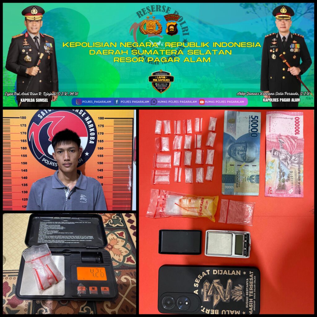 Pagaralam– Upaya kepolisian dalam memberantas peredaran narkoba di Kota Pagar Alam kembali membuahkan hasil. Satuan Reserse Narkoba (Satresnarkoba) Polres Pagar Alam berhasil mengungkap kasus penyalahgunaan narkotika dengan menangkap seorang pemuda berinisial M Moris bin Rolesmon (23) di kontrakannya di Jalan Taman Siswa, Kelurahan Sukorejo, Kecamatan Pagar Alam Utara, pada Rabu malam (22/10/2025).