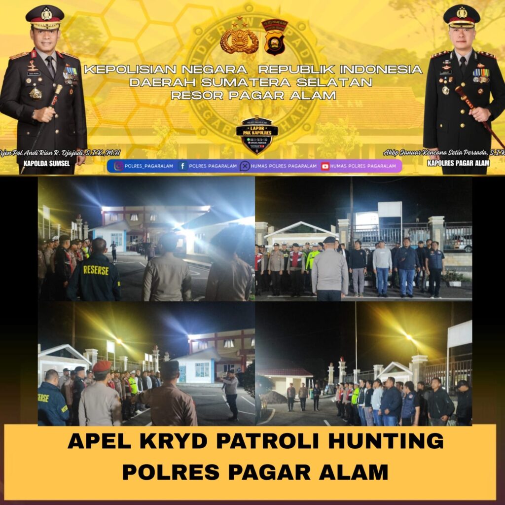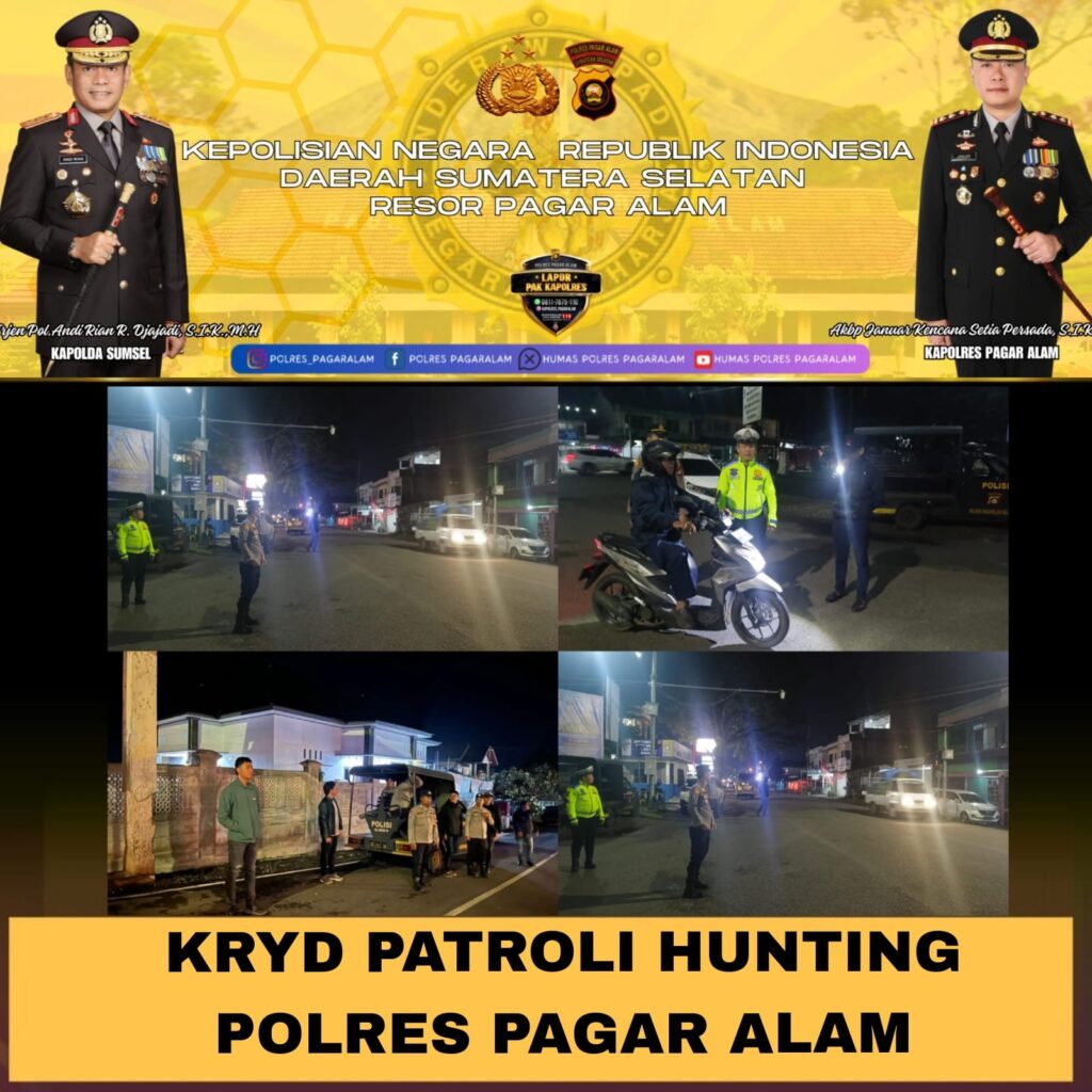 Dalam menciptakan situasi kamtibmas yang aman dan kondusif di wilayah hukum Polres Pagar Alam. Dilaksanakan Patroli Hunting dan Razia yang berlangsung hingga pukul 23.00 wib sasaran utama pada kegiatan tersebut seperti Balap liar dan tindak pidana 3C, lokasi yang me jadi sasaran patroli hunting yaitu kec Pagar Alam Utara dan kec Pagar Alam Selatan, adapun berhasil Patroli dan razia sejumlah tindakan, di antaranya 28 teguran lalu lintas, 22 himbauan kamtibmas, tilang kendaraan R2/R4, SIM/STNK Nihil, Tidak ditemukan senjata tajam maupun narkoba selama operasi berlangsung.