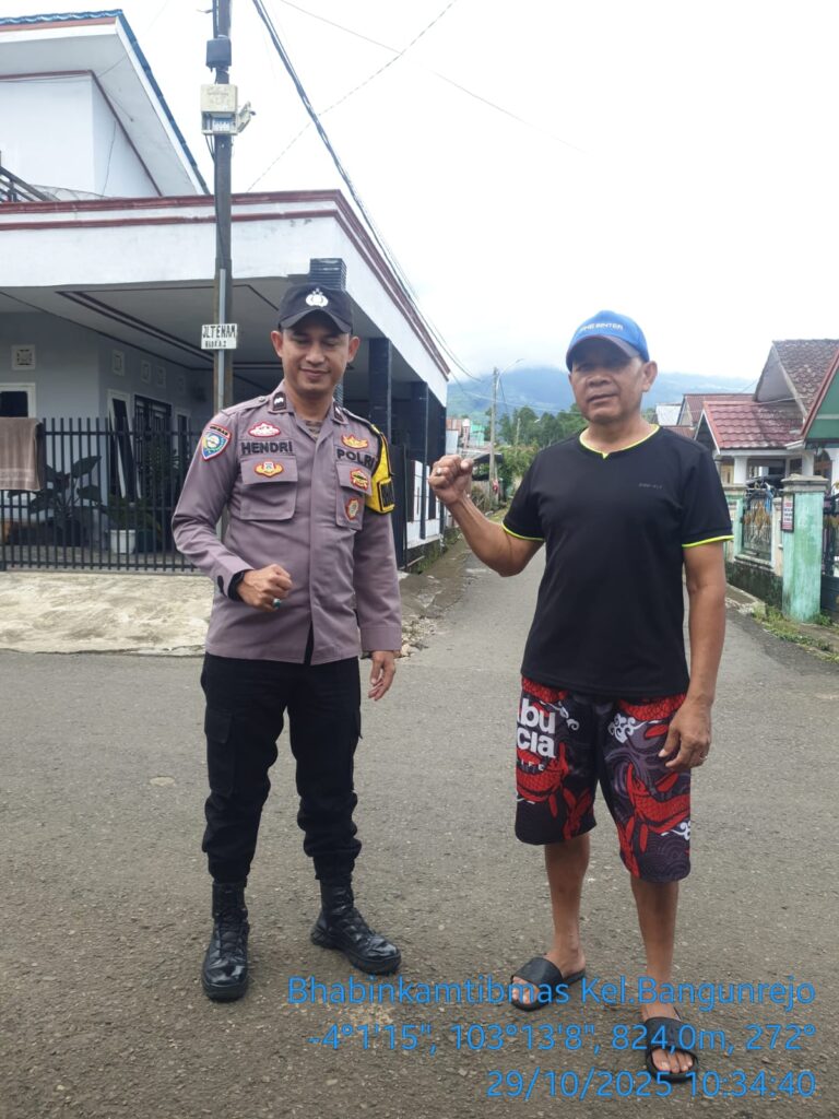 HumasRes Pagar Alam — Polres Pagar Alam di bawah kepemimpinan Kapolres AKBP Januar Kencana Setia Persada, S.I.K melalui Bhabinkamtibmas Kelurahan Bangun Rejo melaksanakan sambang warga untuk memberikan sosialisasi pencegahan kebakaran hutan dan lahan (karhutla) serta menjaga kamtibmas, Kamis (30/10/2025). Kegiatan ini dilakukan di wilayah Dusun Bangun Rejo dan Prumnas Talang Sawah.