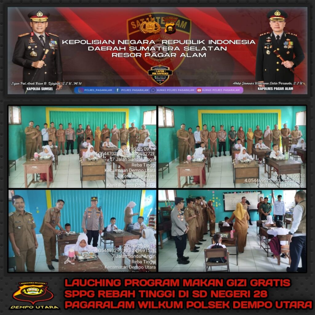 HumasRes Pagaralam – 27 Oktober 2025 Kapolsek Dempo Utara Iptu Rudi Widarto menghadiri kegiatan Launching Makan Bergizi Gratis (MBG) Satuan Pelayanan Pemenuhan Gizi (SPPG) Kelurahan Rebah Tinggi yang digelar di SD Negeri 28 Kota Pagaralam. Kegiatan ini bertujuan meningkatkan kualitas gizi peserta didik serta mendukung program pemerintah dalam membangun generasi sehat dan cerdas.